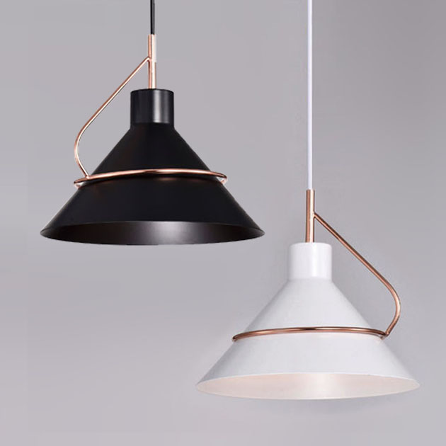 Son design se distingue par un anneau et une tige latérale en cuivre brossé qui viennent “embrasser” l’abat-jour conique, créant un contraste moderne et élégant. Qu’elle soit installée seule au-dessus d’un coin lecture ou en série au-dessus d’un îlot de cuisine, elle diffuse une lumière directe et chaleureuse.
