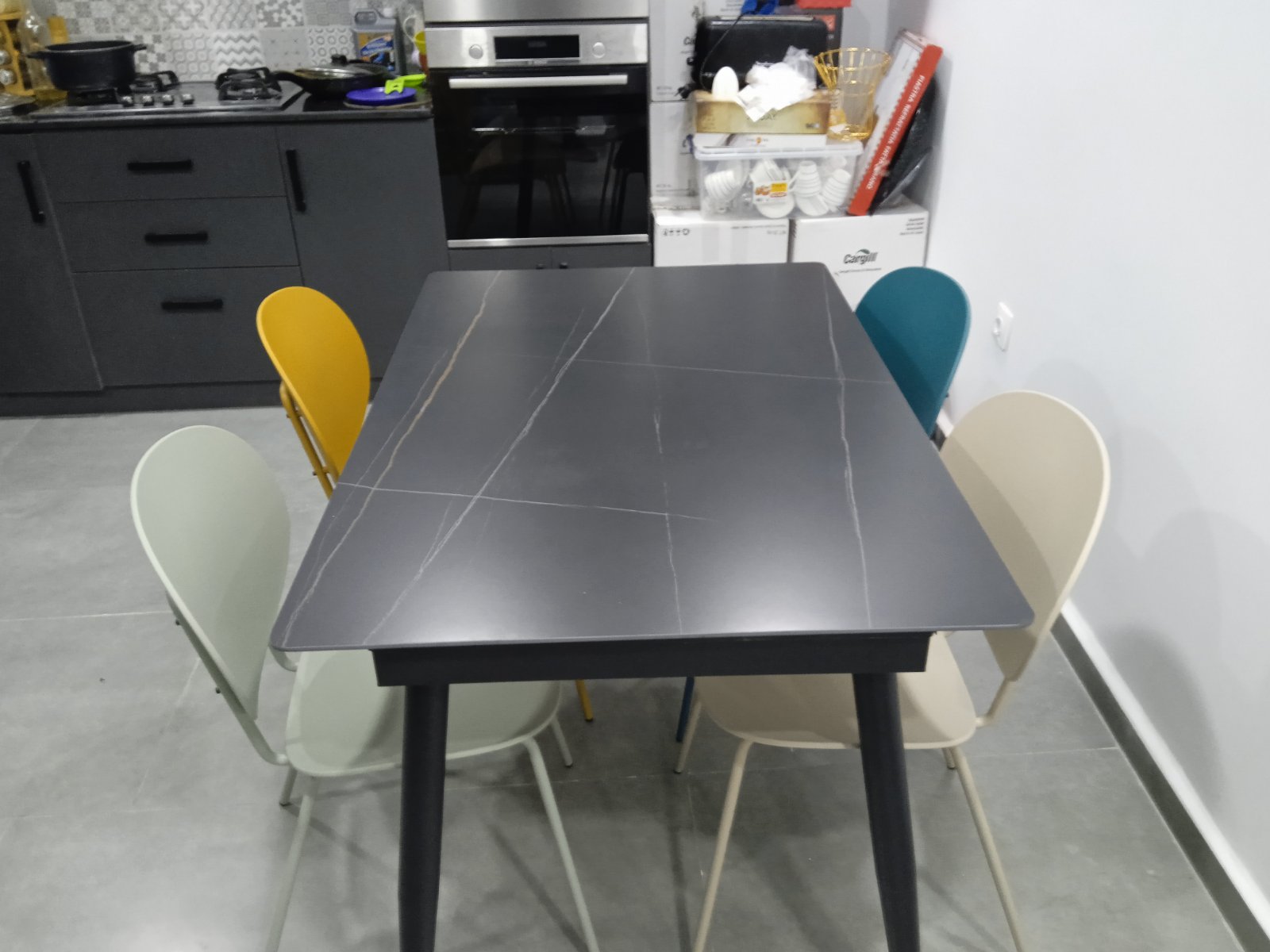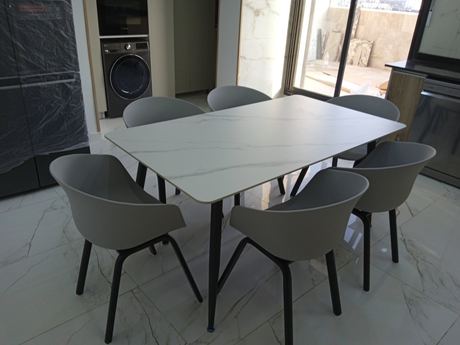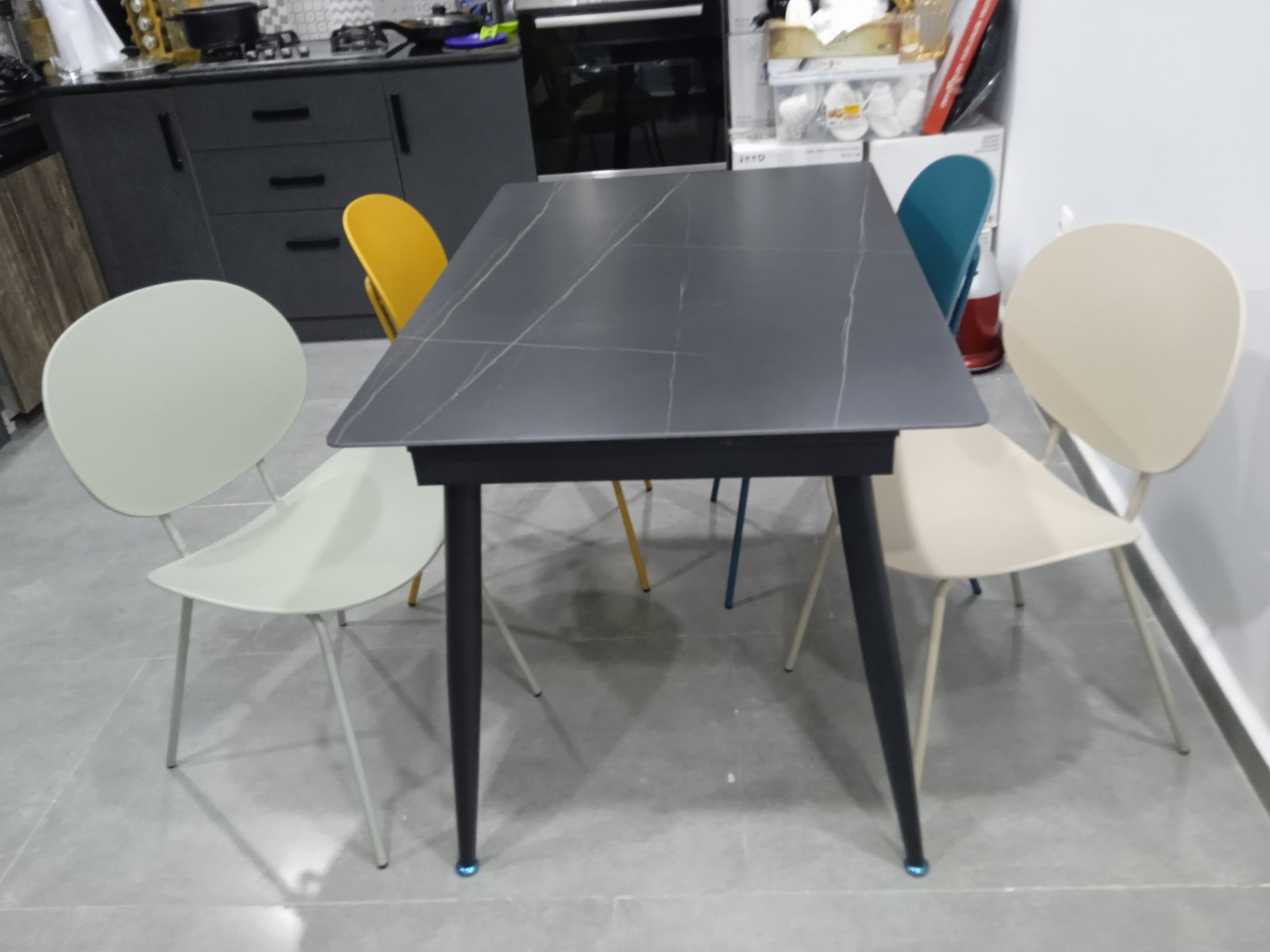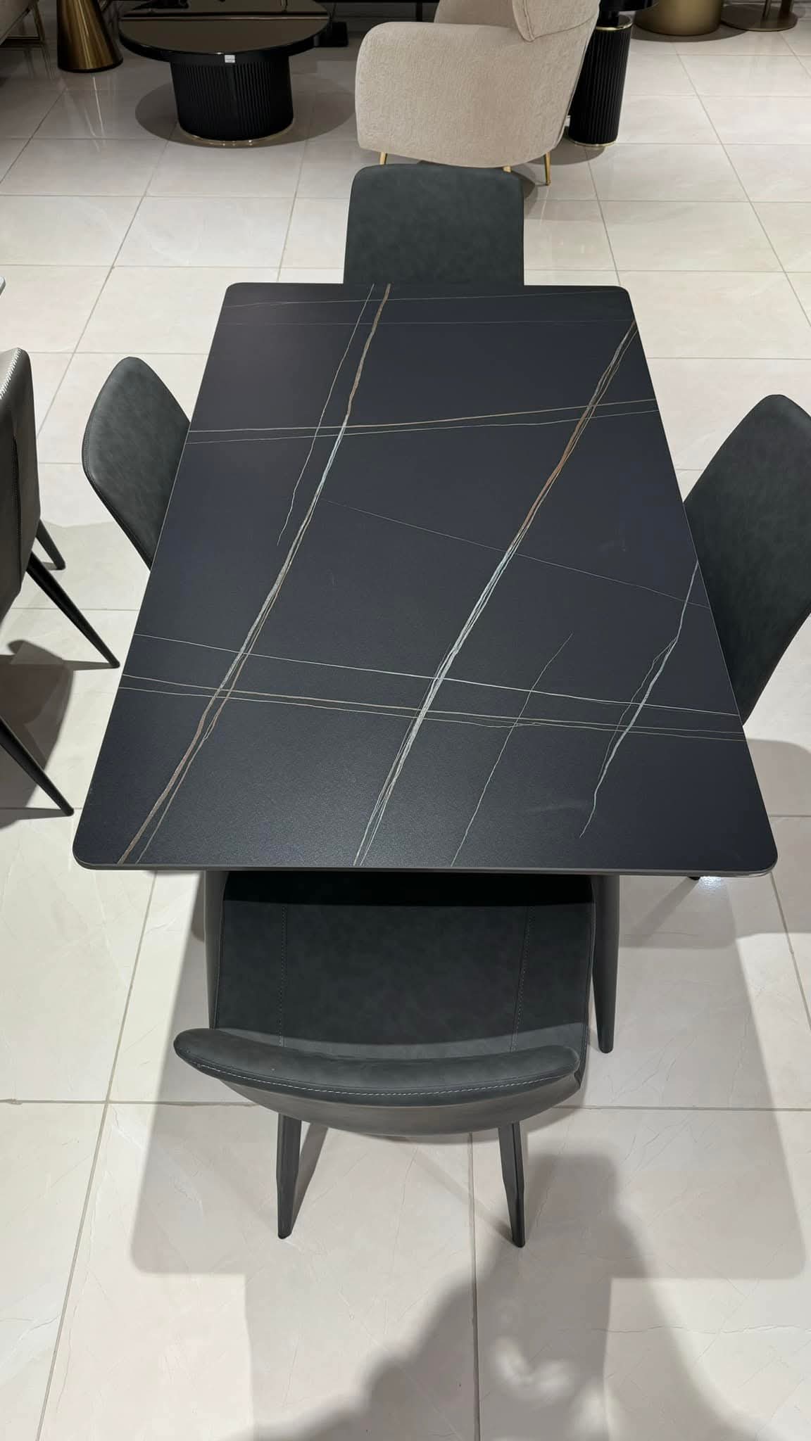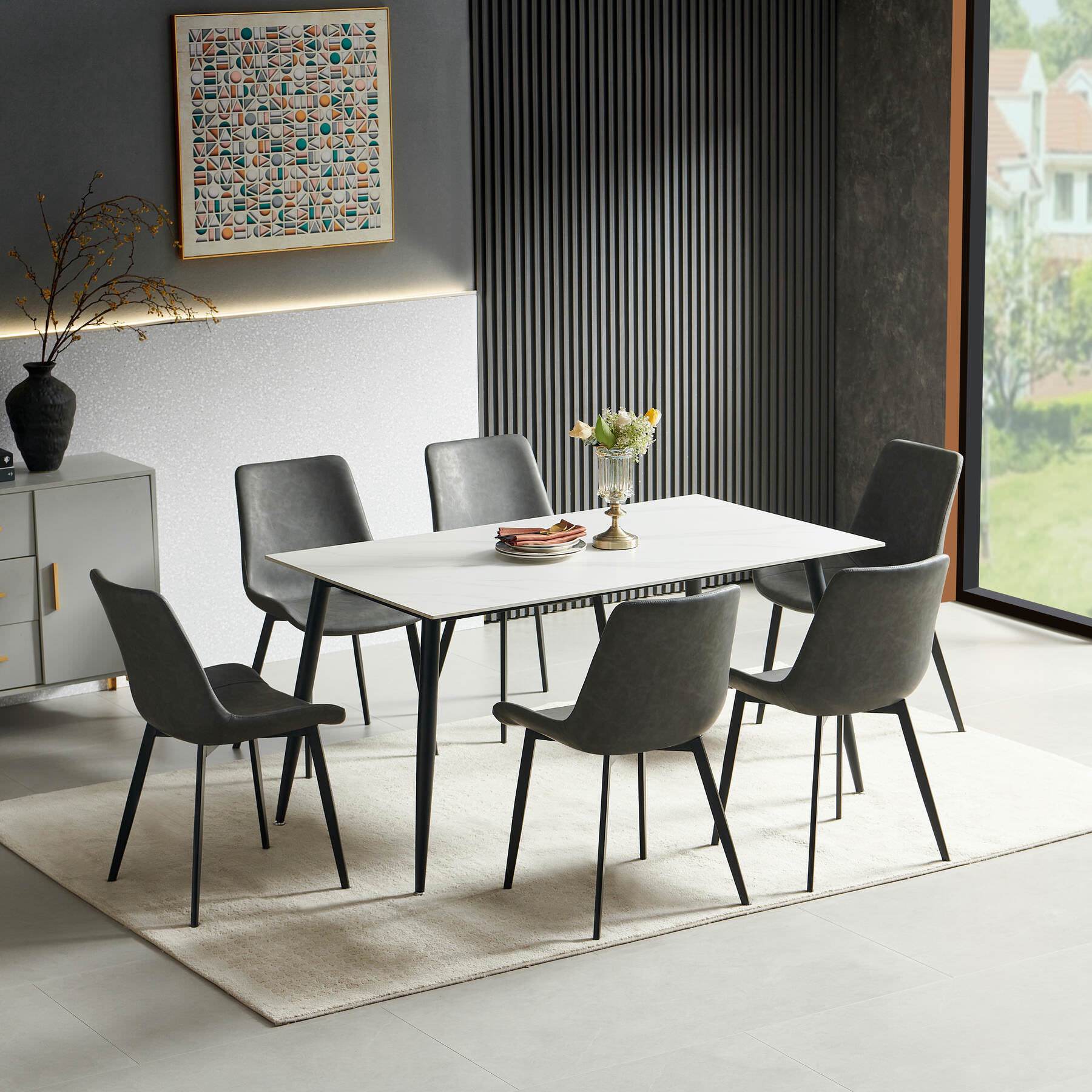 La combinaison du plateau effet roche et du piètement noir crée une table contemporaine, parfaite pour les intérieurs minimalistes, industriels ou élégants.