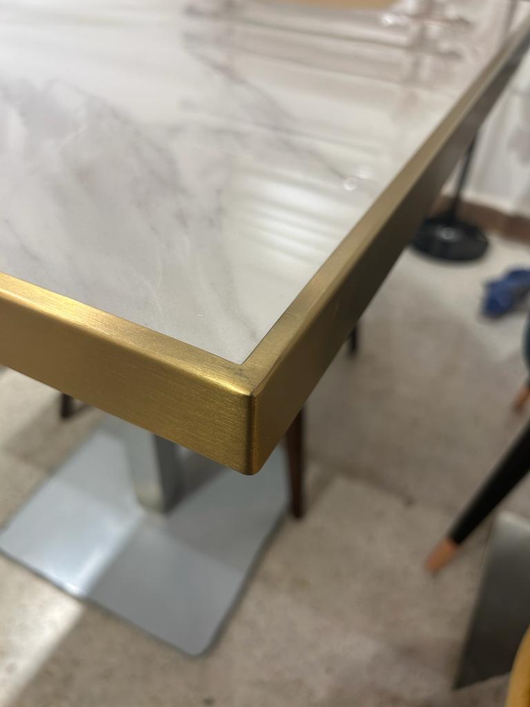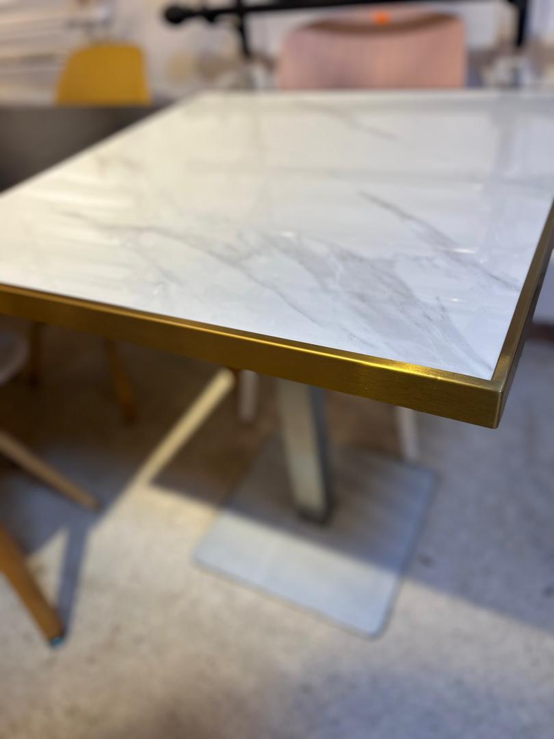 Alliez design moderne et élégance intemporelle avec cette table en quartz artificiel au plateau carré 80×80 cm. Sa bordure dorée brillante apporte une touche de luxe, tandis que son pied central en métal noir ou chromé offre stabilité et allure contemporaine.